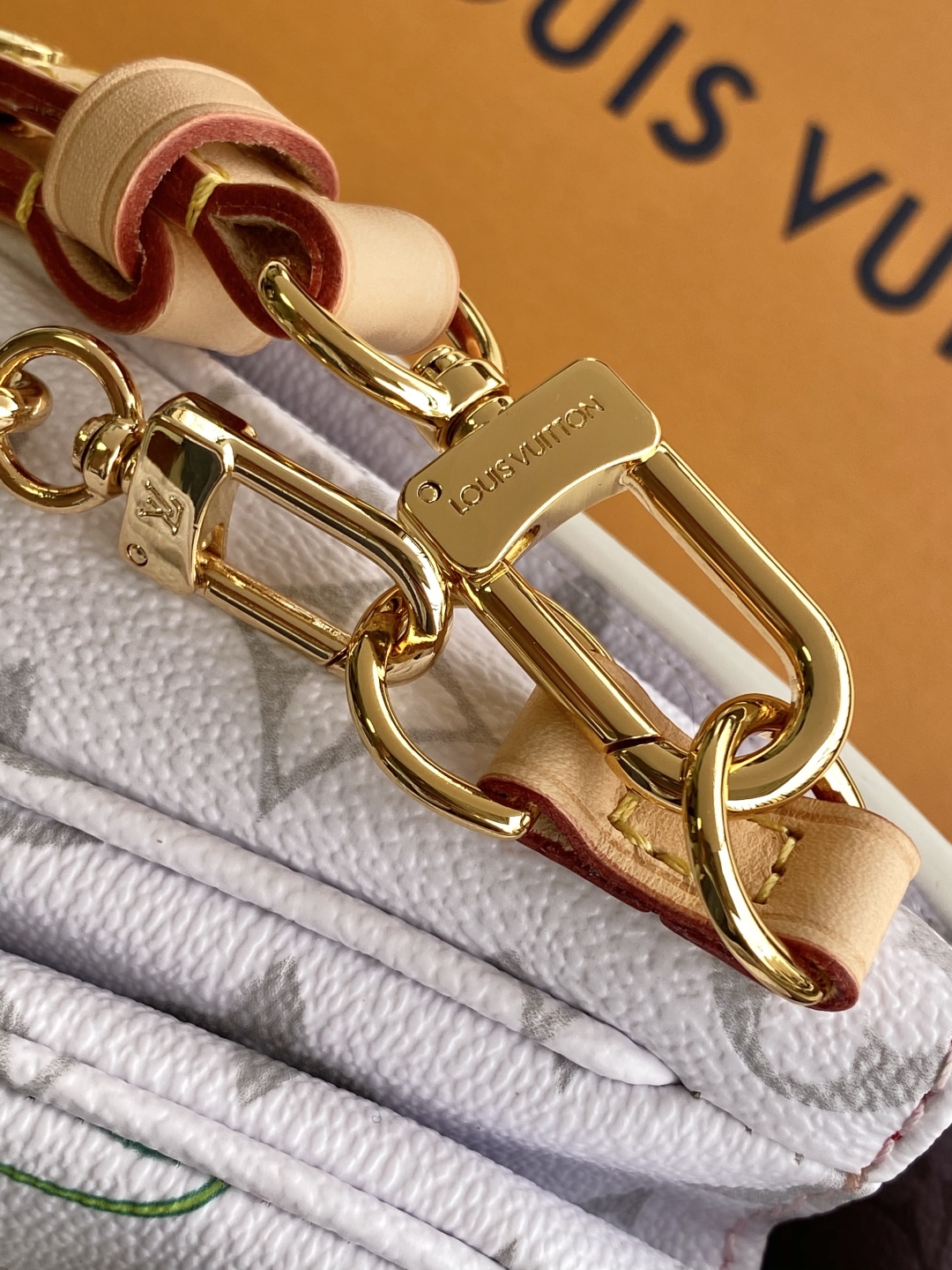 Forthe shoulderstraps, we use thesame materialas the originaland use 16 colors ofyarn, wovenwith a 3D machine, theLouis Vuitton letters are verythree-dimensional,unlike others whichare wovenby machinesand thenprintedwith colors. And the thickness ofour shoulder straps is very thick, the same asthe original