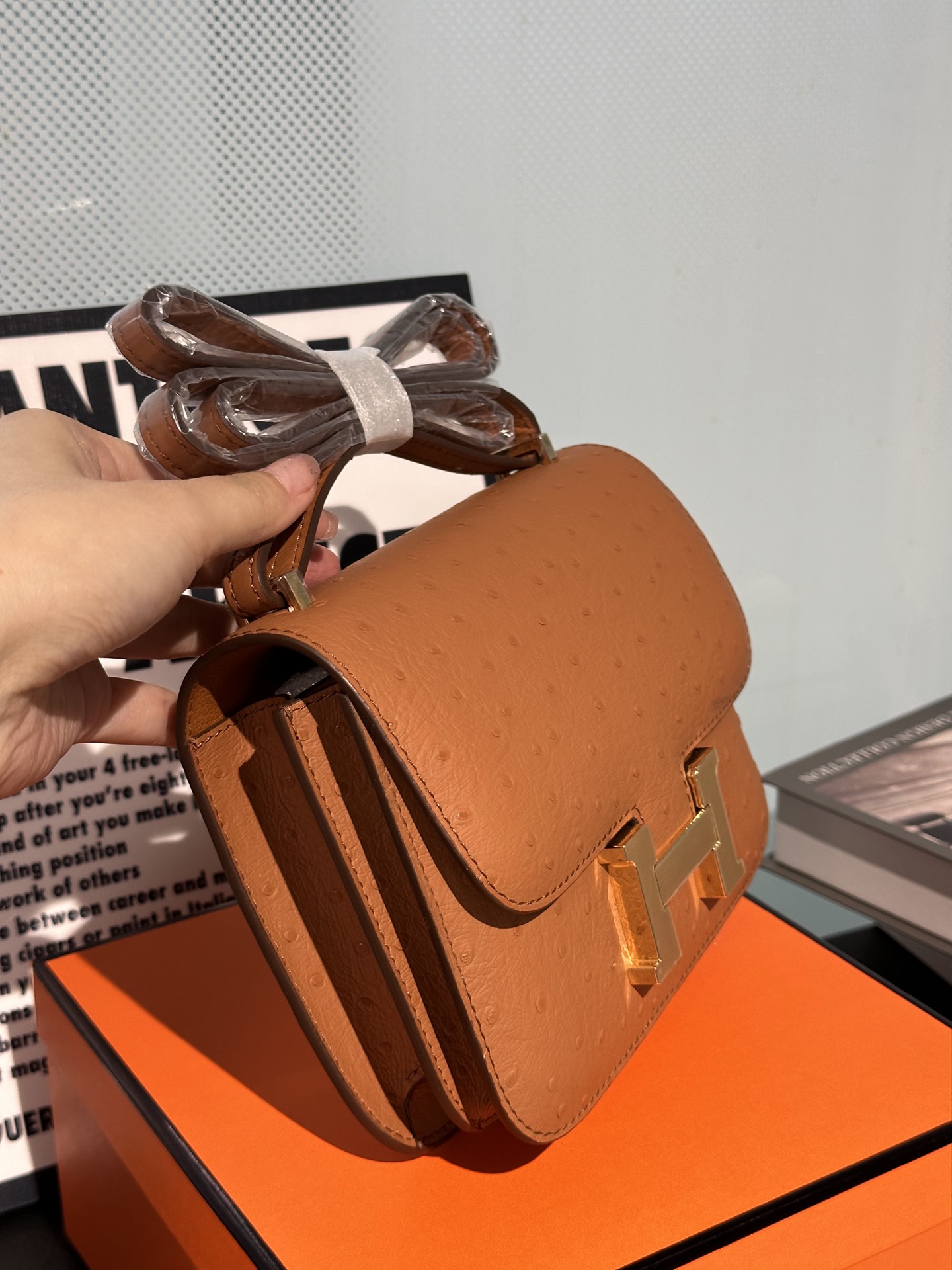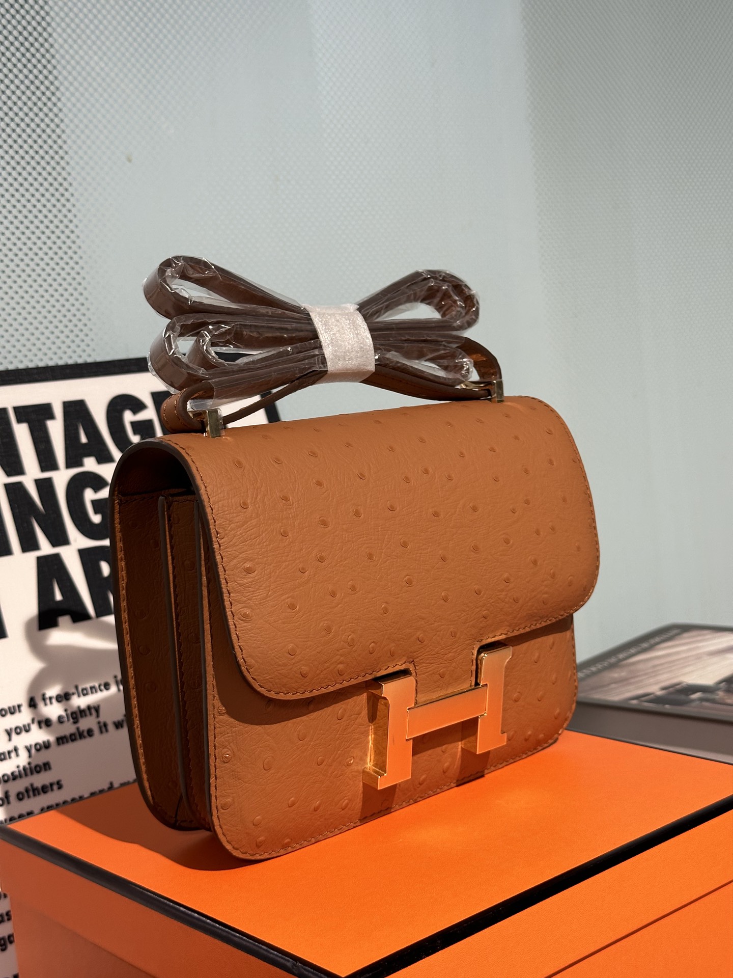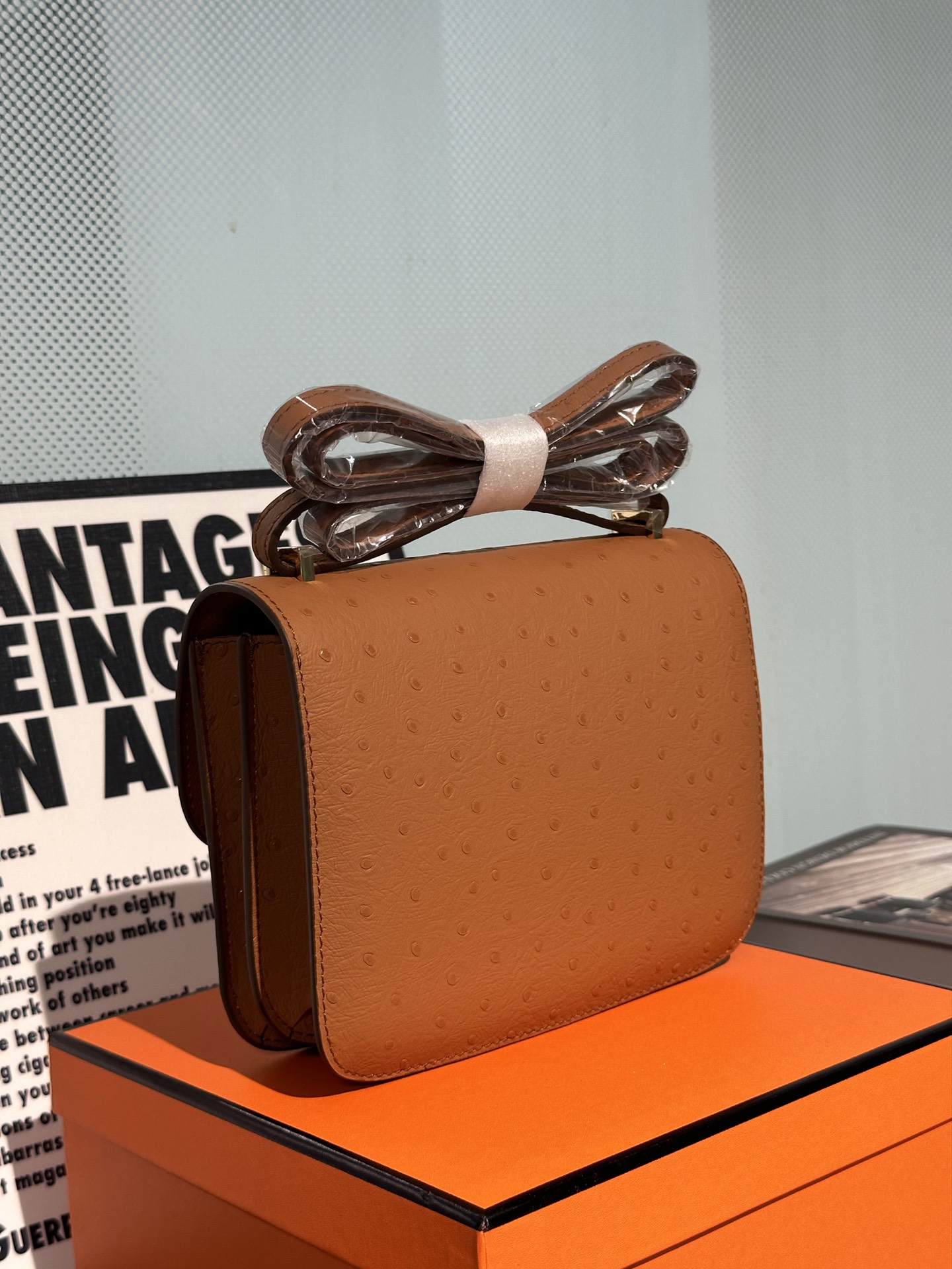 「#4315」Hermès Brown Ostrich Grain Leather Constance Gold Buckle Stewardess Bag 19cm