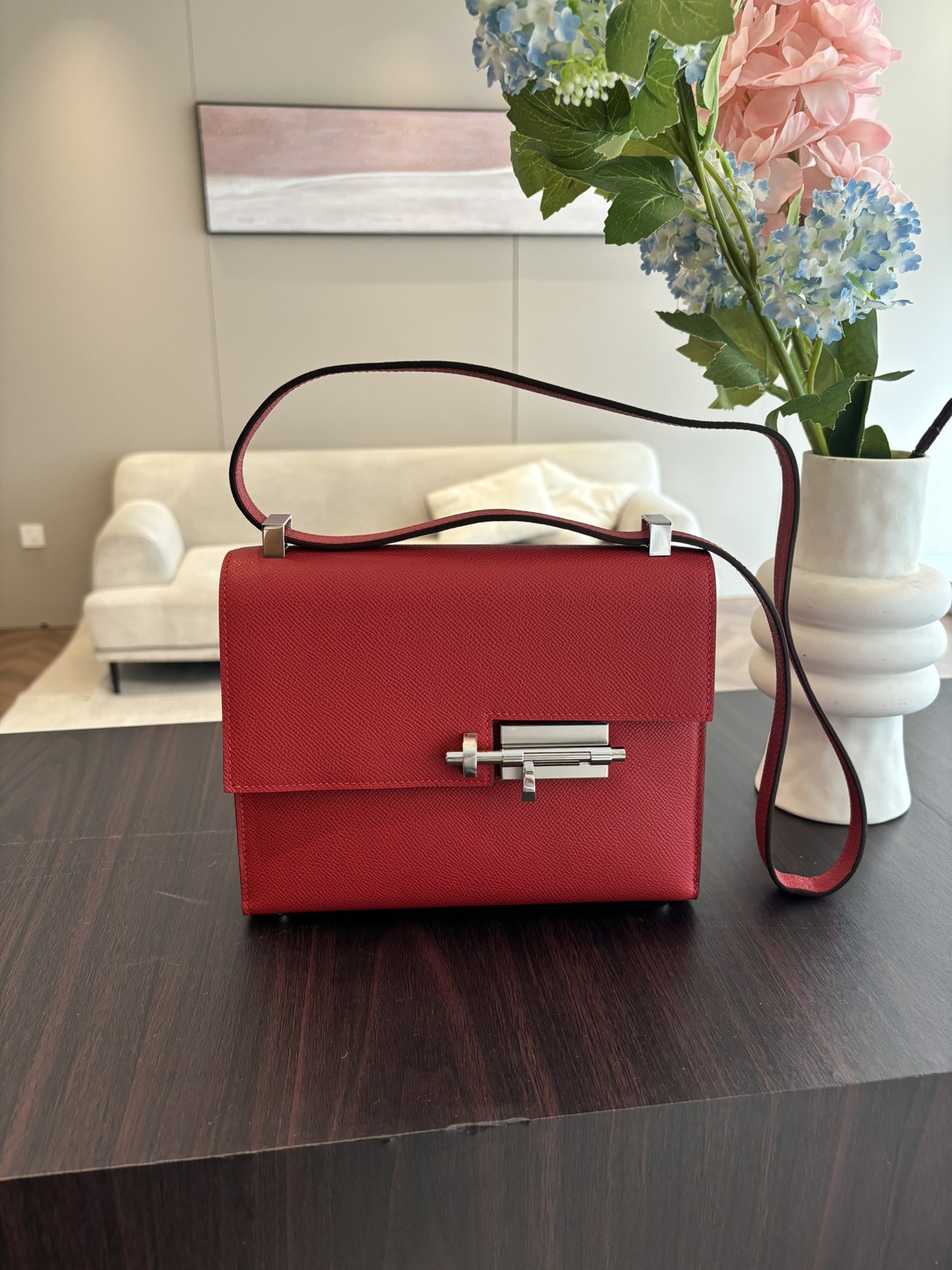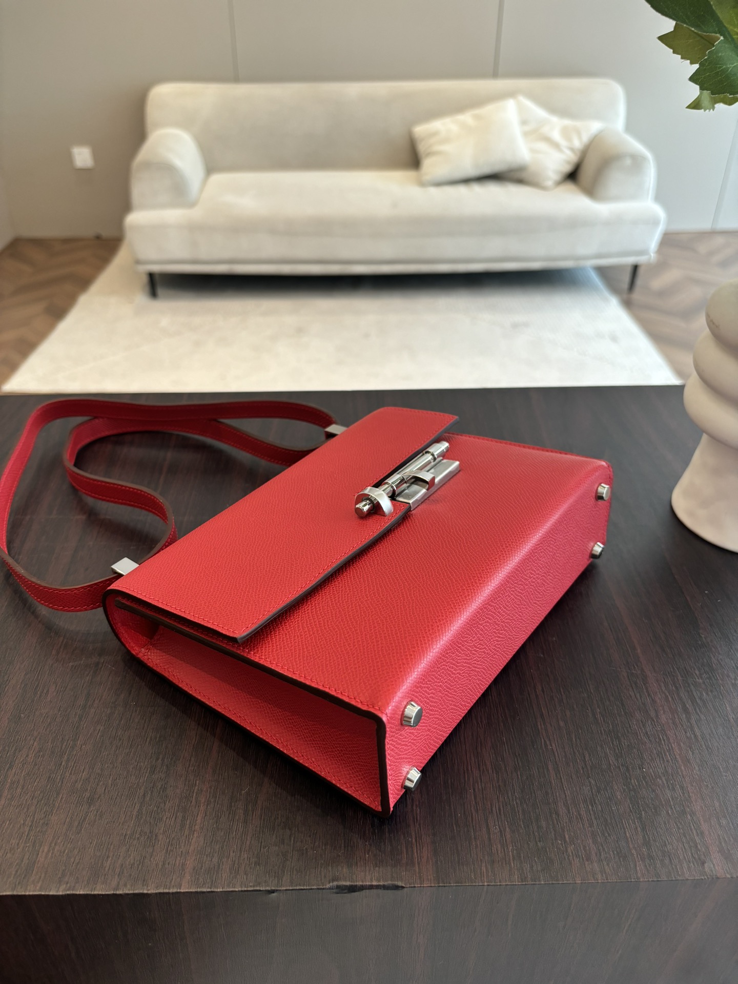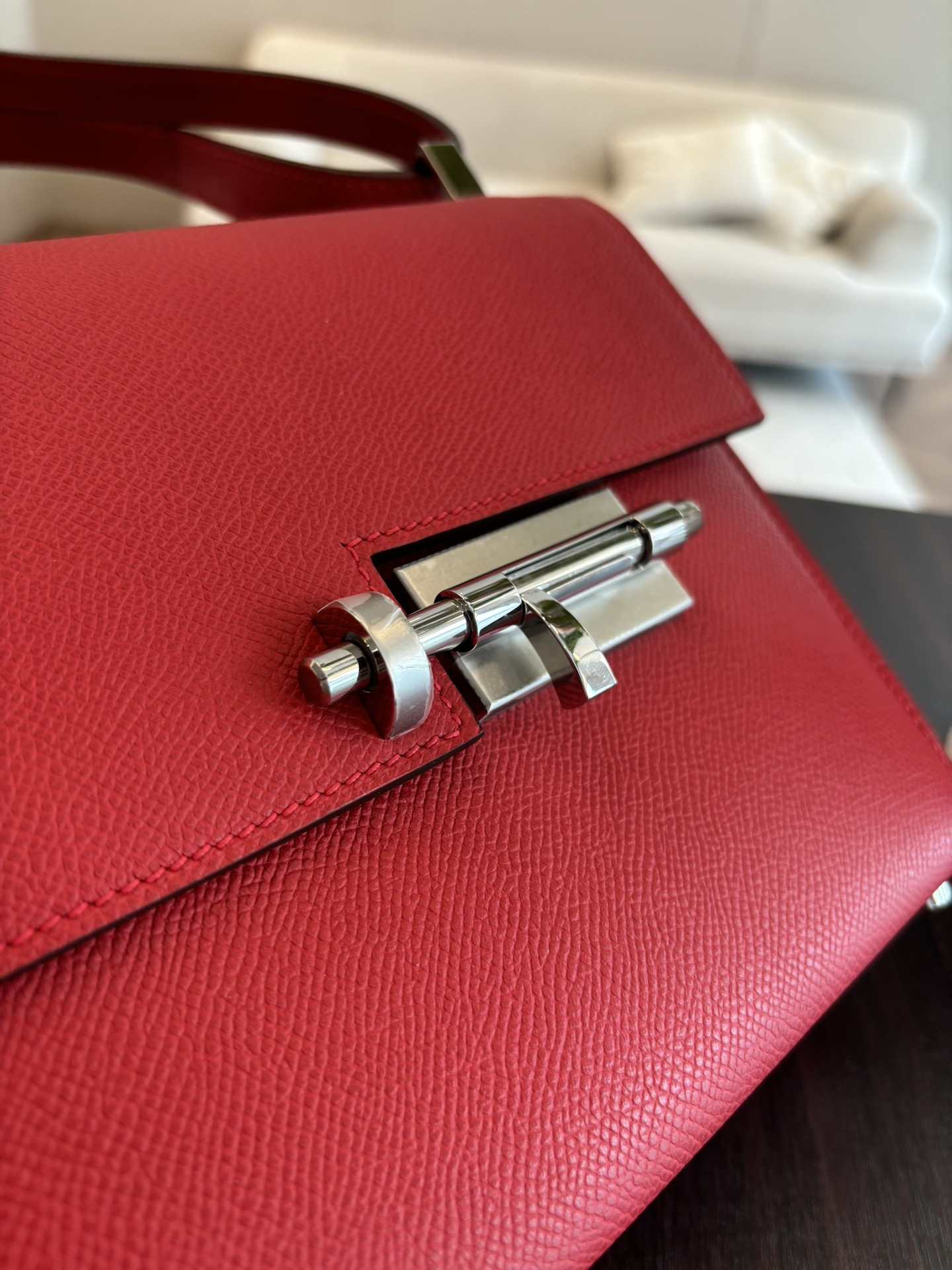 「#4528」 Hermes pistol bag red Verrou epsom leather stainless steel hardware semi-handmade wax thread sewing 21cm
