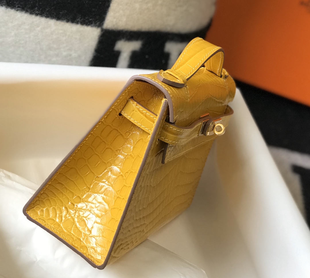「#4091」 Hermès Evening Bag Yellow Crocodile Leather Mini Kelly Bag No. 1 Gold Buckle 22*14*7cm