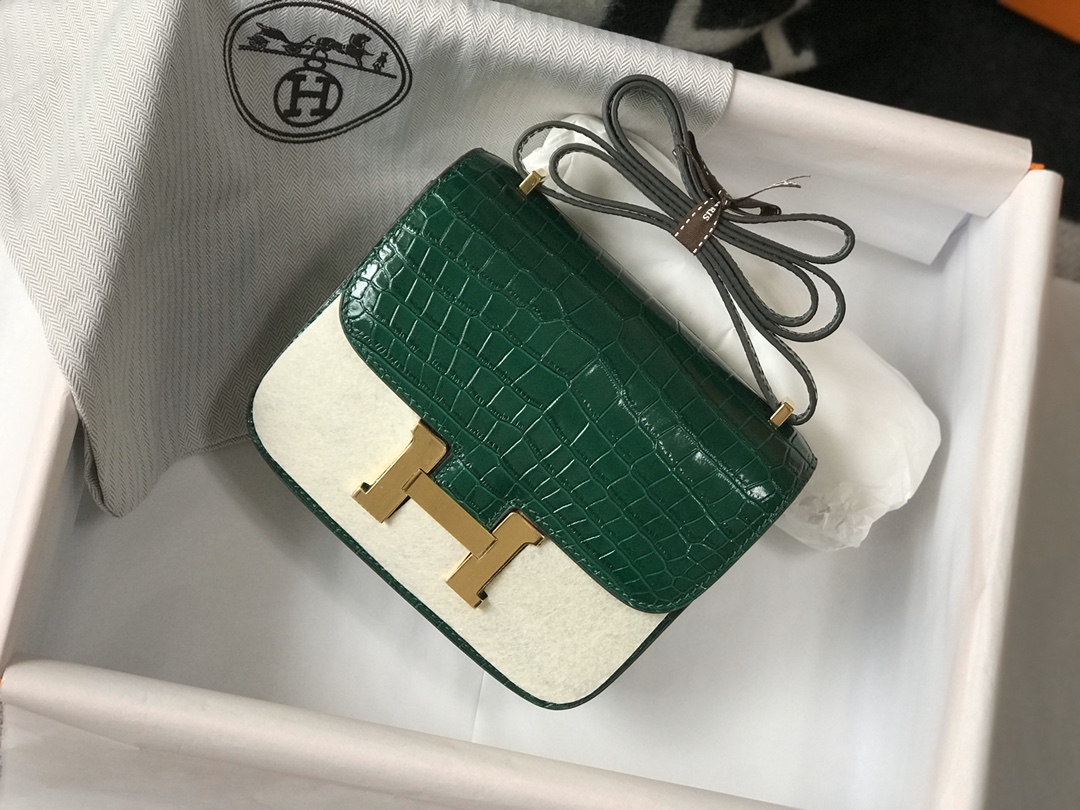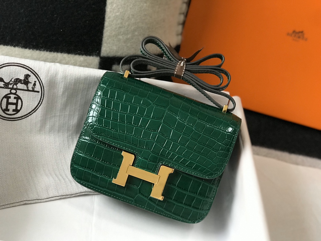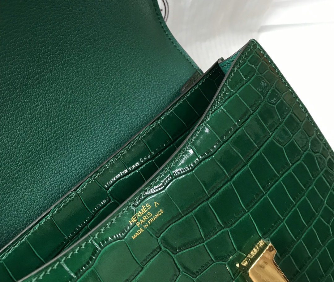 「#4297」 Hermès Constance Green Crocodile Pattern Gold Buckle Bag 19cm