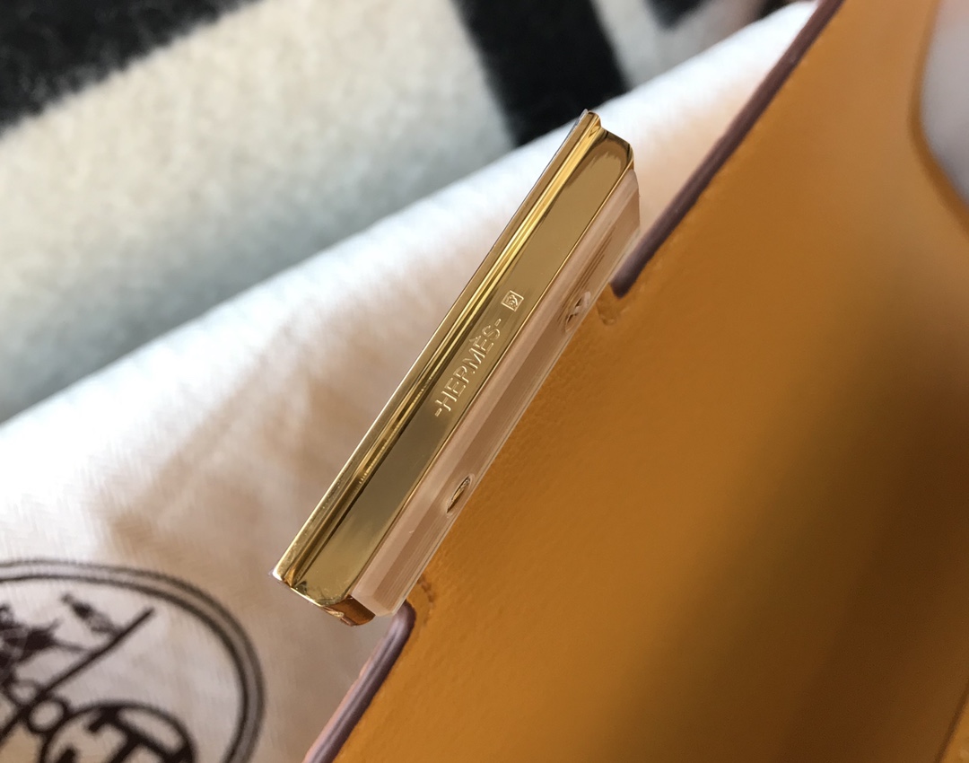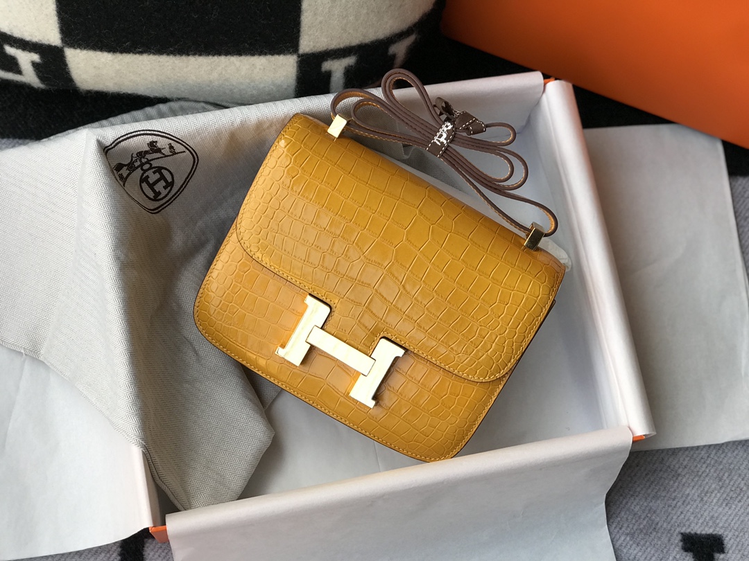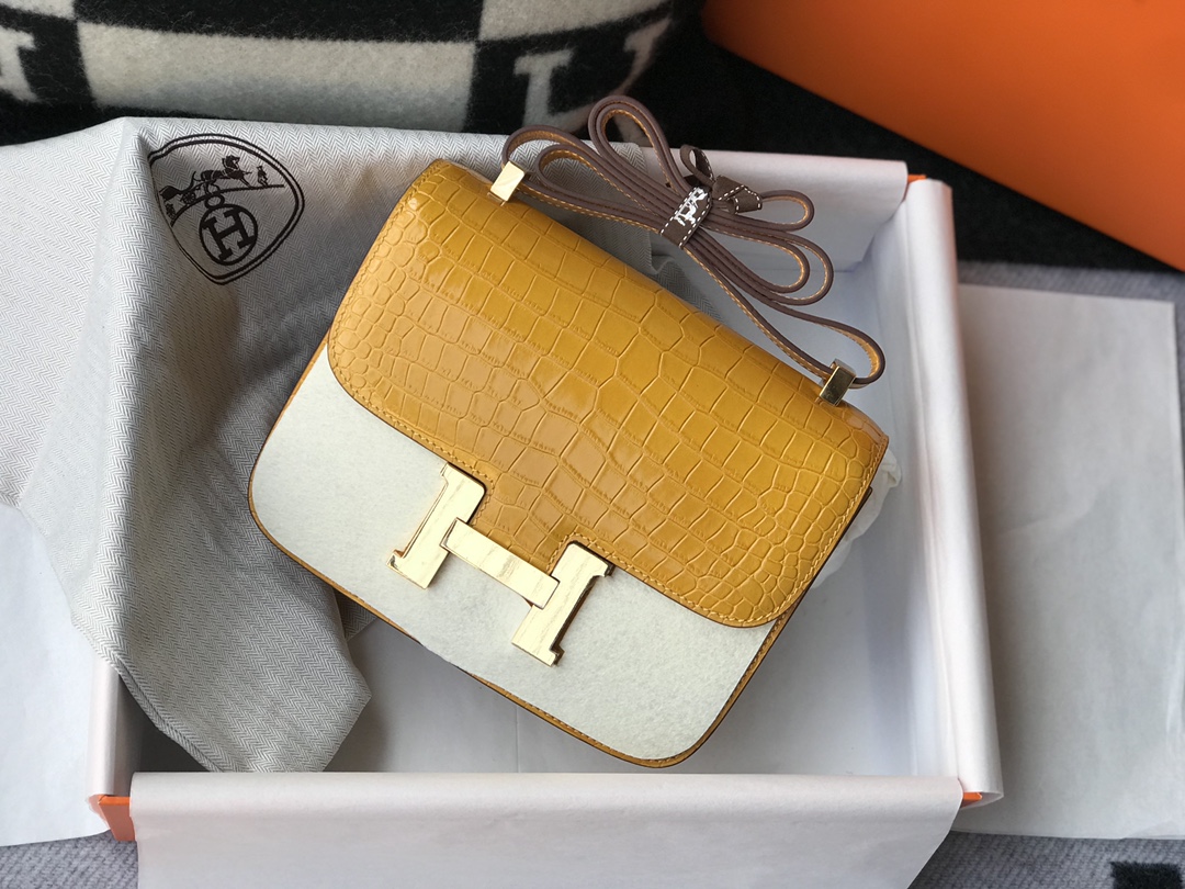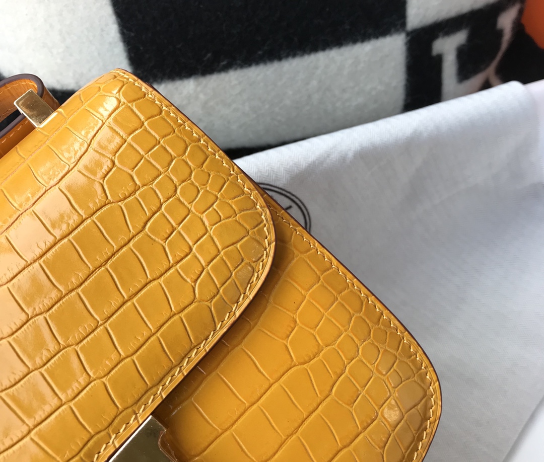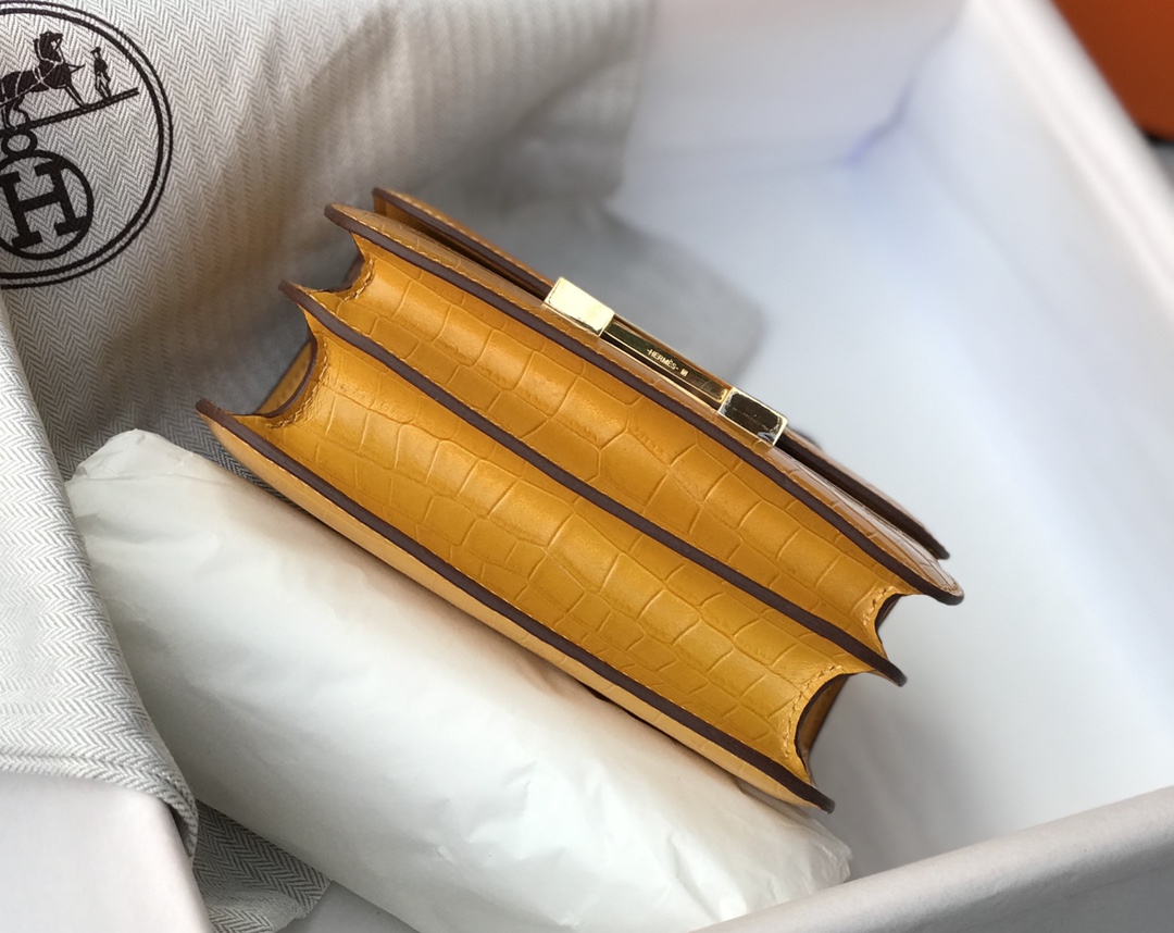 「#4298」 Hermès Constance Yellow Crocodile Pattern Gold Buckle Bag 19cm