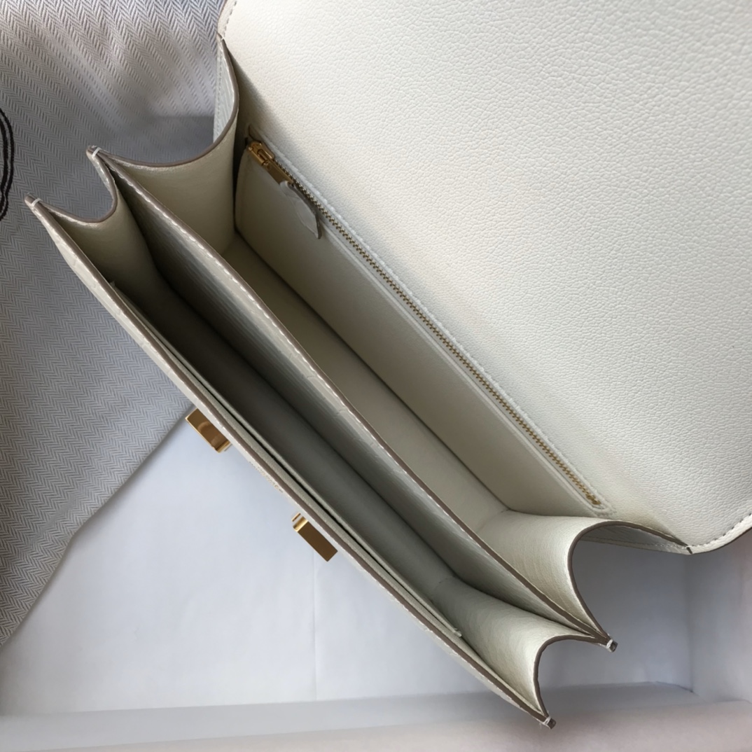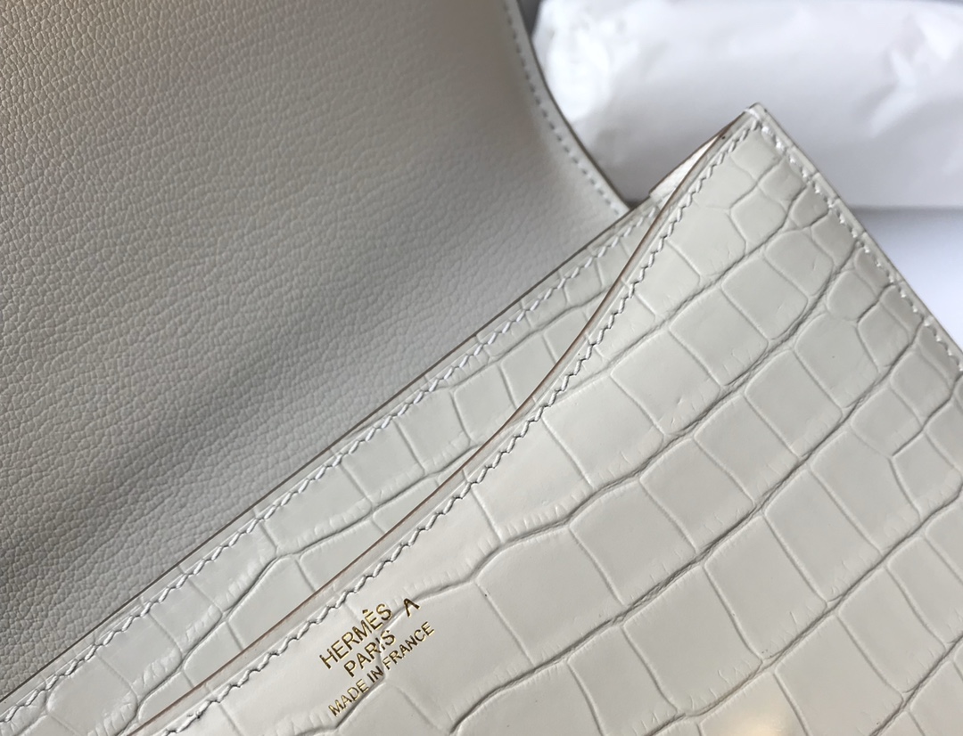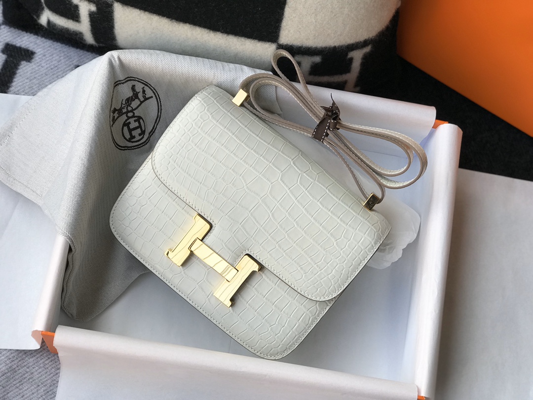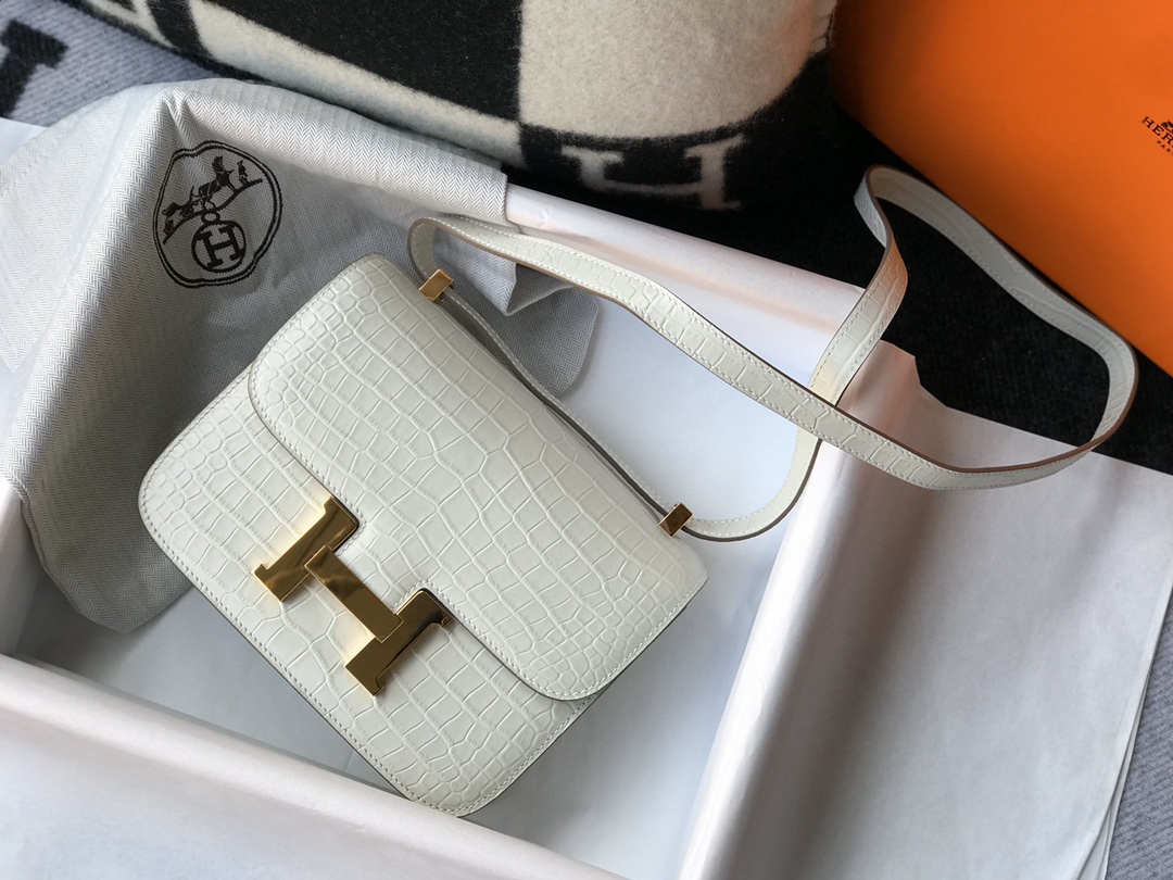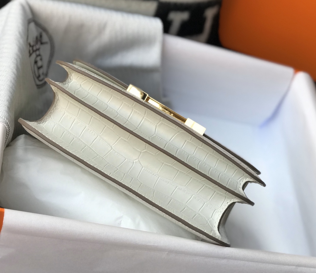 「#4312」 Hermès White Crocodile Pattern Constance Gold Buckle Stewardess Bag 19cm