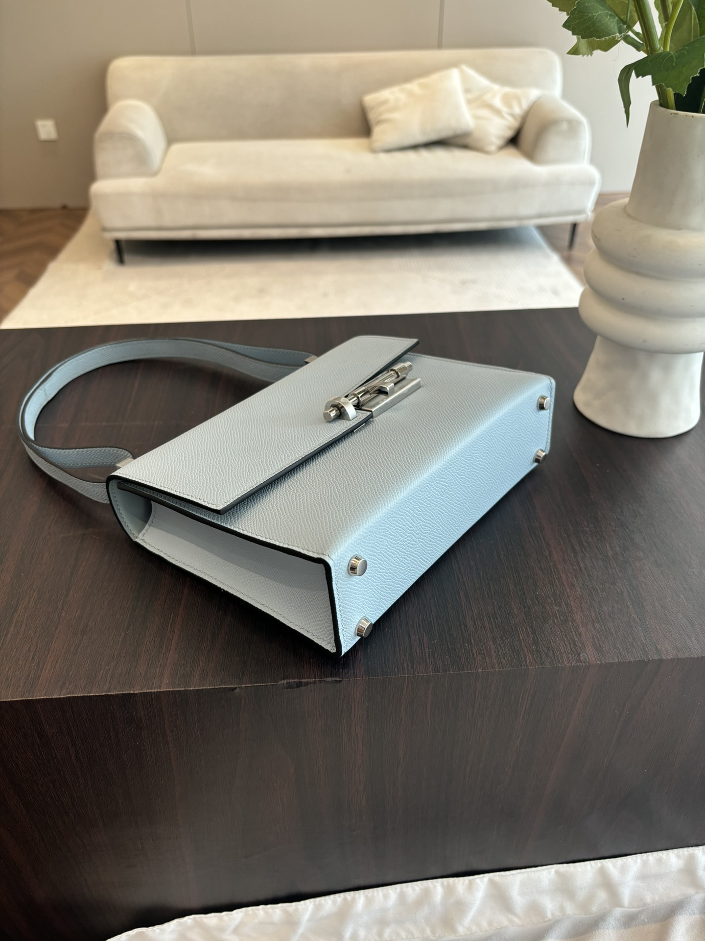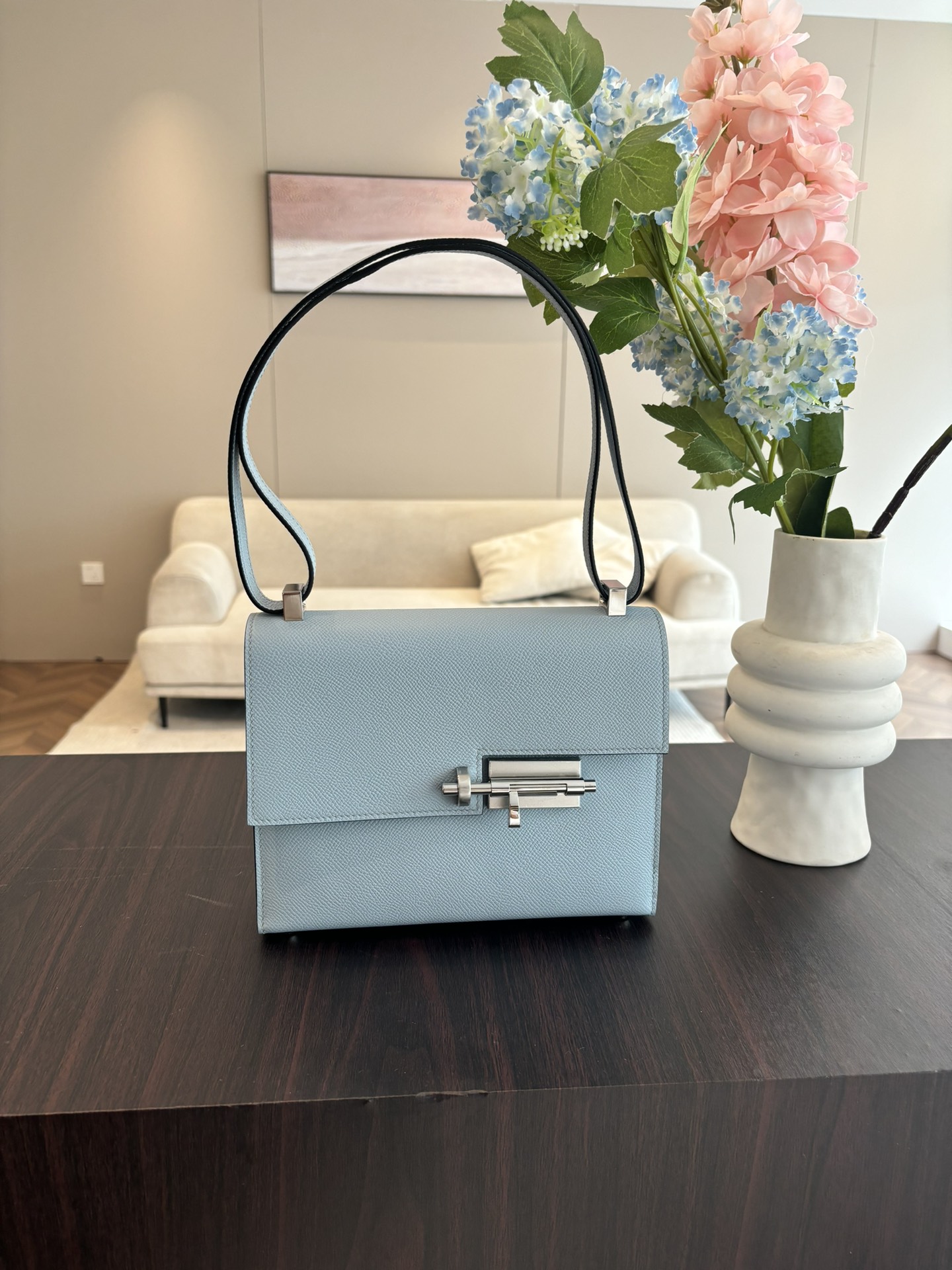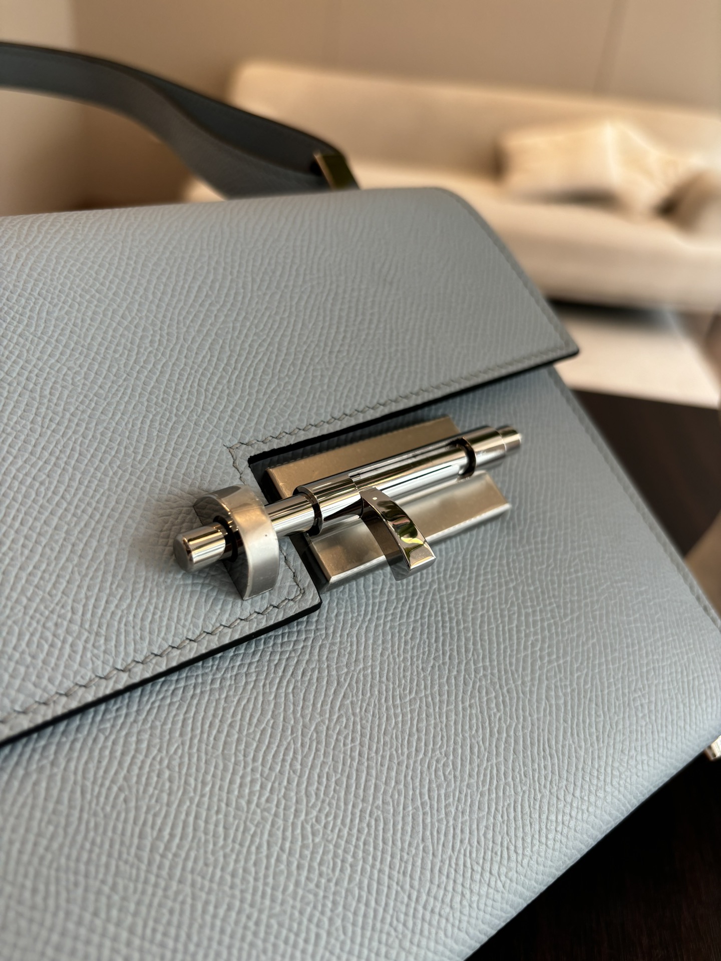 「#4523」 Hermes Pistol Bag Haze Blue Verrou Epsom Leather Stainless Steel Hardware Semi-Handmade Wax Thread Sewing 21cm
