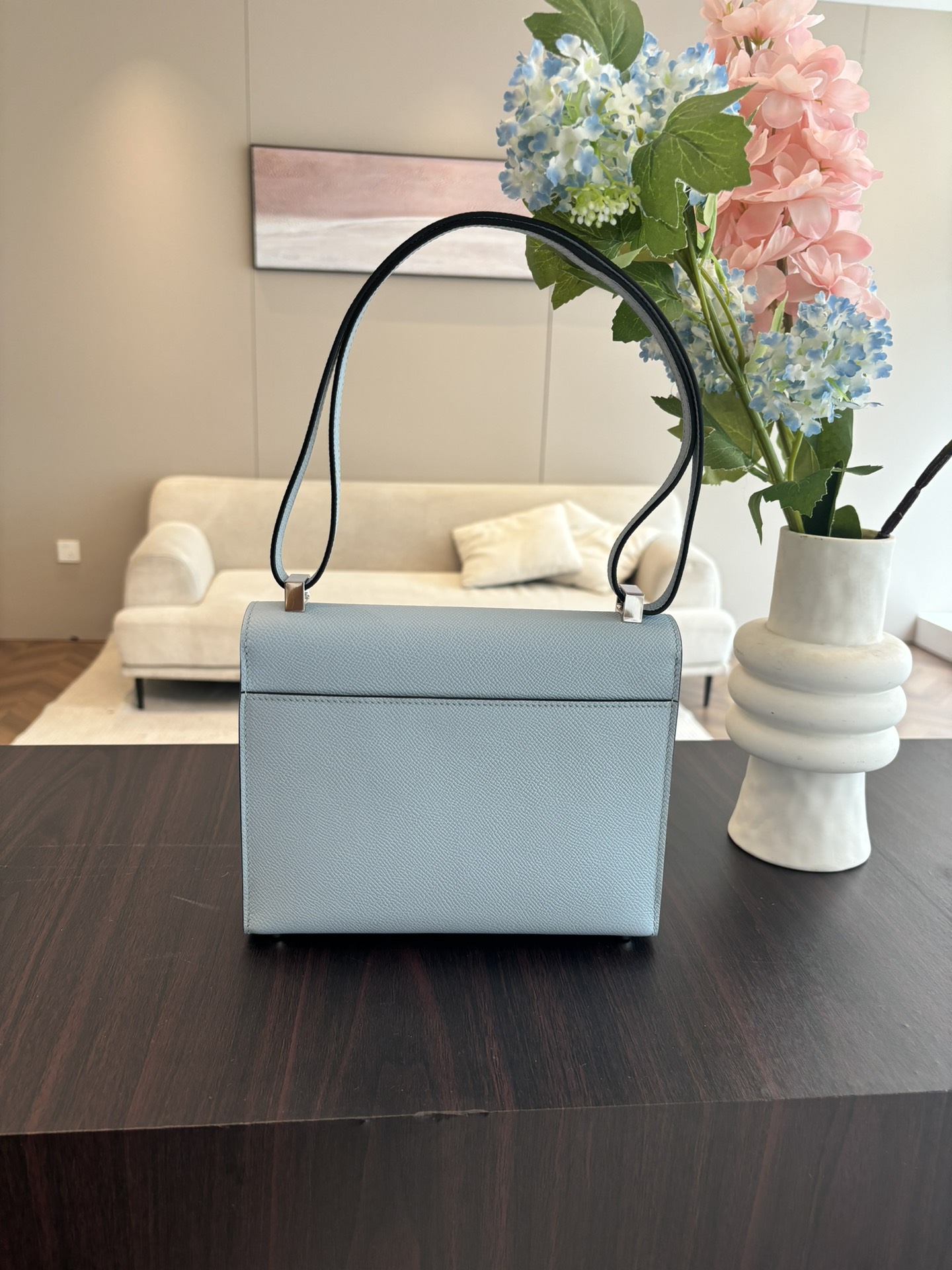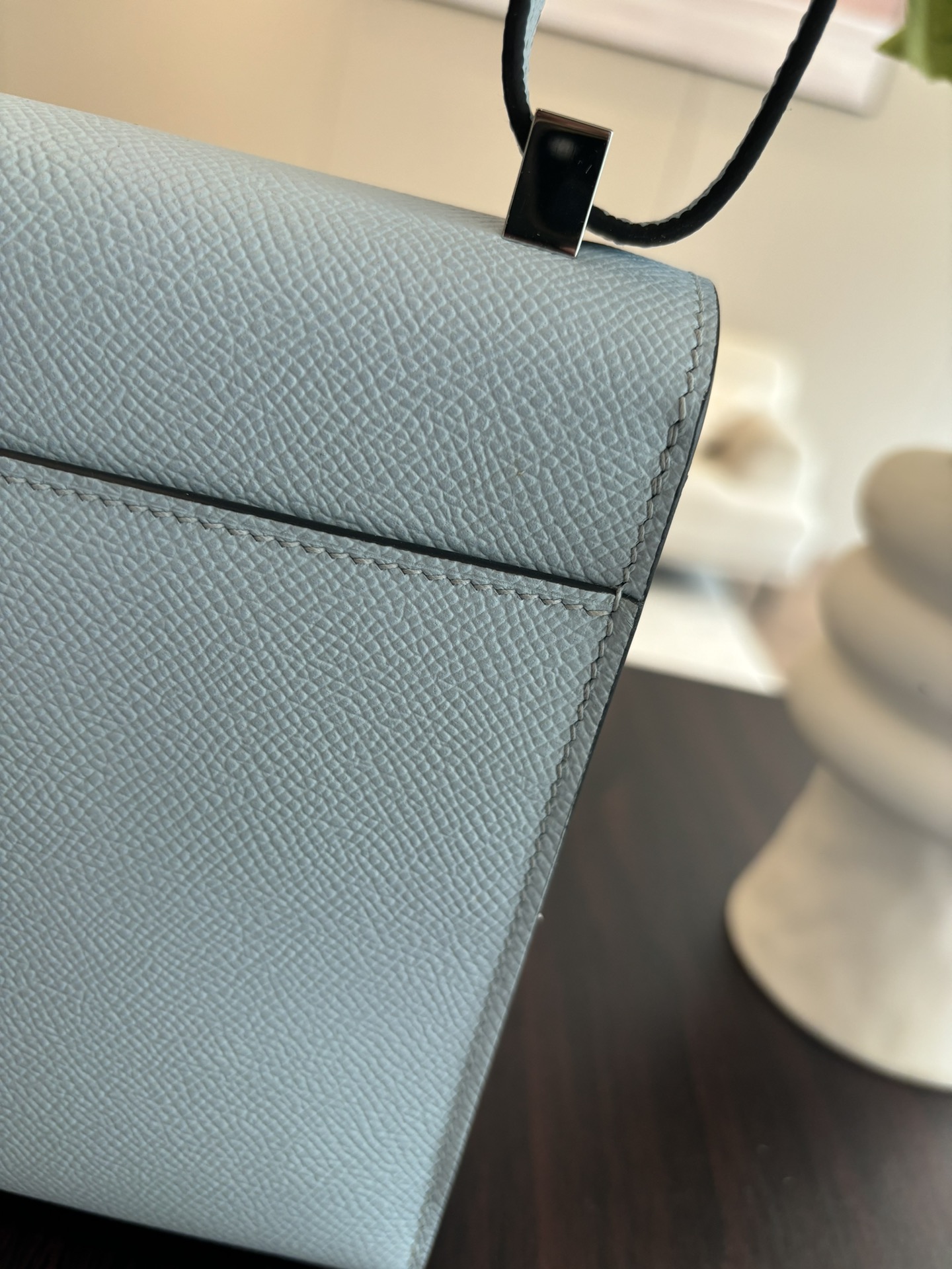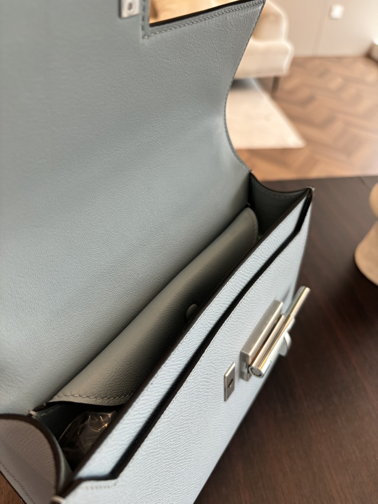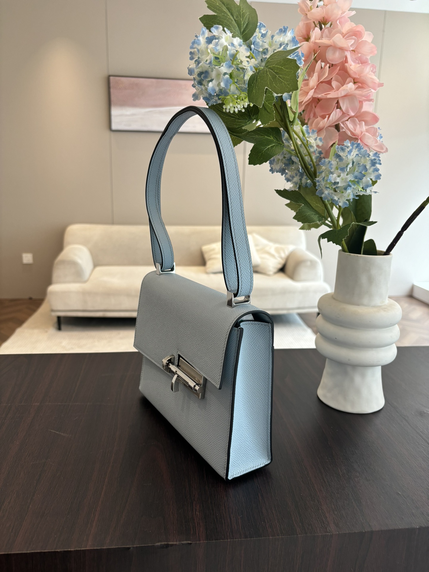 「#4523」 Hermes Pistol Bag Haze Blue Verrou Epsom Leather Stainless Steel Hardware Semi-Handmade Wax Thread Sewing 21cm
